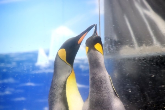 アドベンチャーワールドの海獣館です。種の異なるペンギンが1羽いますよ。左端の立っているペンギンはキン...