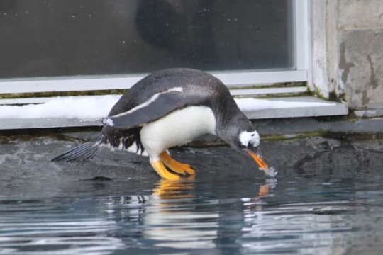 同じく旭山動物園のジェンツーです。プールのフチに器用に立って、水に浮く氷のカケラを拾っています。ちょ...