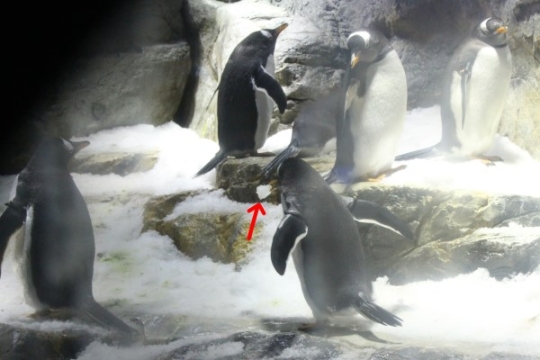 海遊館のジェンツー、クチバシにくわえて運んでいるのは、小石サイズの雪塊です。それをじっと見ている仲間...