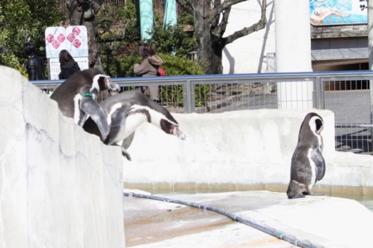 飛び降りる?飛び降りない? 迷っているっぽいフンボルトと、今にも押しそうなフンボルト。名古屋東山動植...