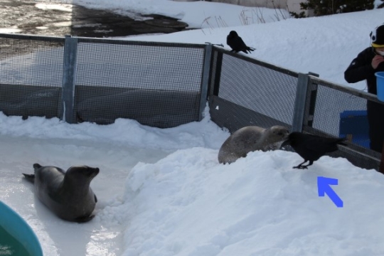 おたる水族館の御子様アザラシたち、お食事タイムです。カラスがやって来て雪山の上にとまると、アザラシが...