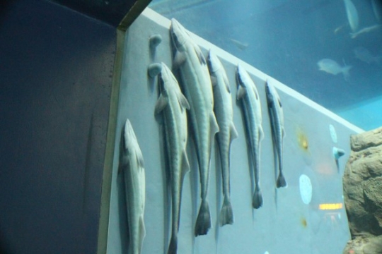 海遊館のコバンザメはキッチリと列を整えて休憩します。頭に吸盤があって壁にはりついているので、こちら側...