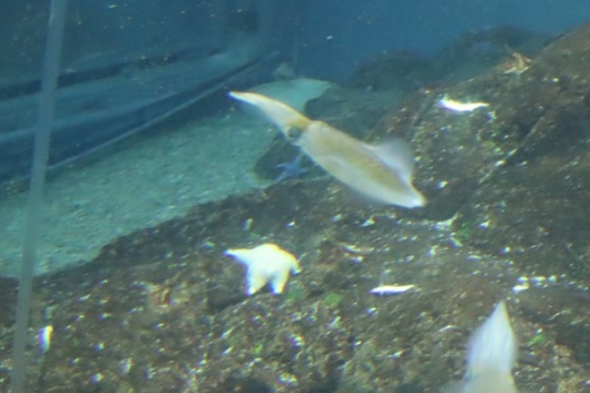 海遊館のアオリイカがいる水槽の岩の上、白くて太った『何か』が必死で逃げていくような形になっています。...