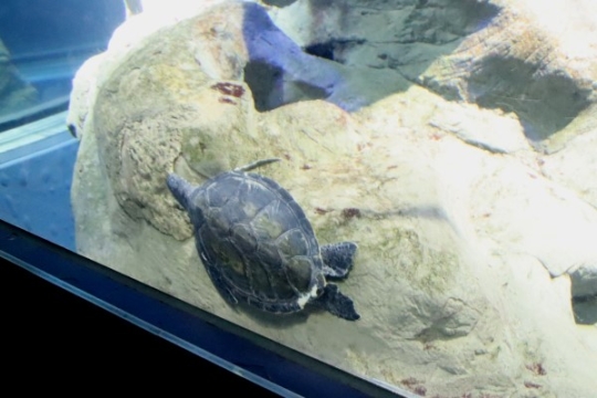 海遊館のアオウミガメ、足をもぞもぞさせるのですが、位置が変わりません。心配そうに人が立ち止まって見て...