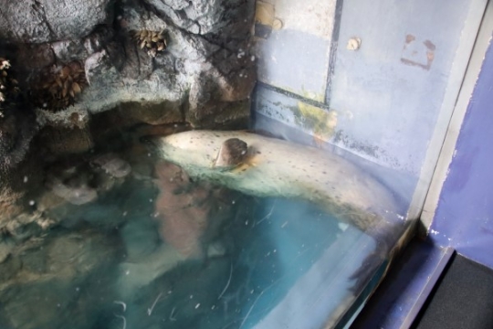 海遊館のペンギンにたどり着くまでに、アザラシ前を通ります。こんなふうにパッと見ギョッとするようなスタ...