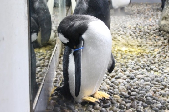 海遊館のアデリー、『ペンギンロール』を見事に決めました! 羽づくろいするこの姿勢、ロールケーキの断面...