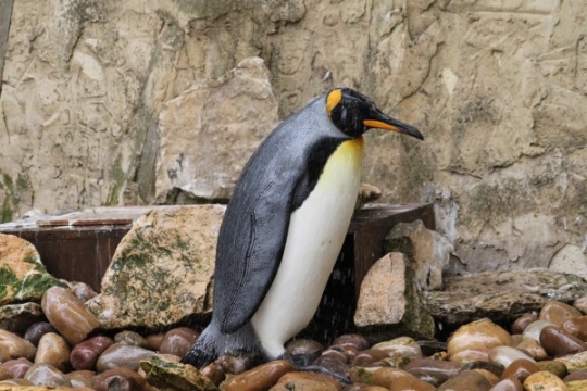 越前松島水族館のキング、手前にいる2羽のうち右側は首なしペンギン、左はその種明かしアングル。「息が苦...