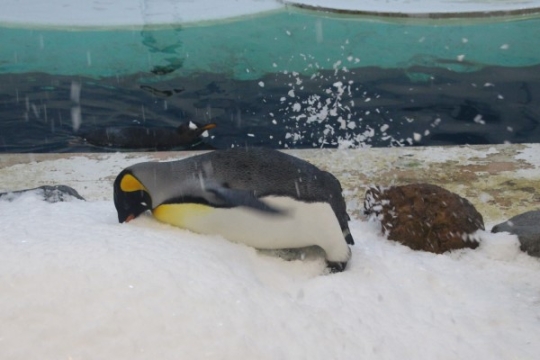 マゼランペンギンがバッタリところびました。プール目指してスロープをかけおりていて、勢いがつきすぎたの...