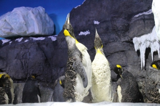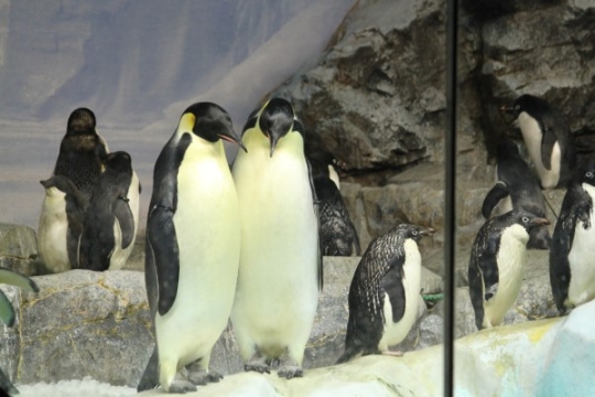 名古屋港水族館のエンペラー、ペアになるのでしょうか、仲良しポーズをとっています。うつむいてちょっと身...