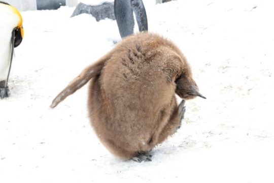 ペンギンの頭カキカキ、キングのヒナもできます。身体にぐっと押しつけているフリッパーが深いもふもふに埋...