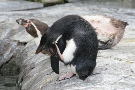 ペンギンの頭かき、ラストはイワトビの亜成鳥です。斜面でもうまくバランスをとっていますね。身体の大きさ...
