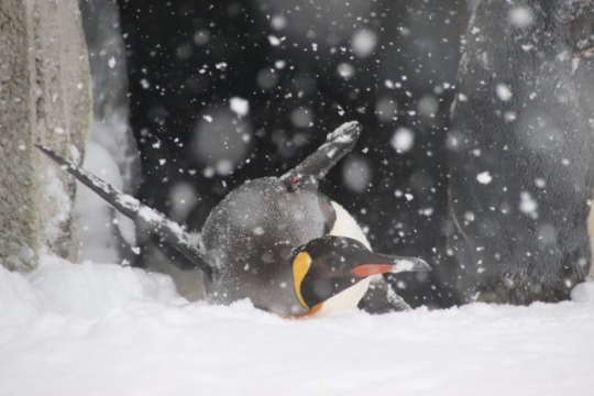 残暑ますます厳しい折、涼しいペンギン写真をお届けします。旭山動物園のキング、雪に大はしゃぎの図。ーー...