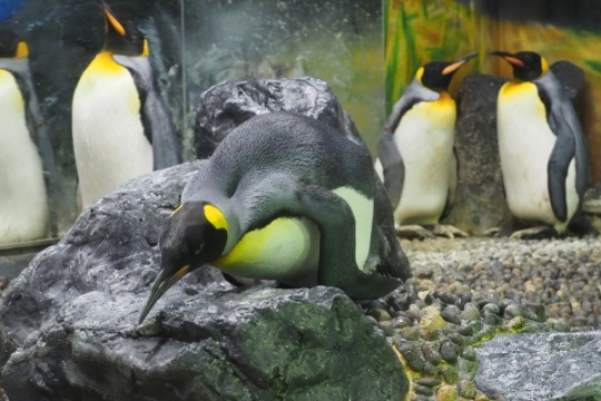 長崎ペンギン水族館のキング、グループでそろって羽繕いしてます。念入りに羽繕いしたあとは、お昼寝するこ...