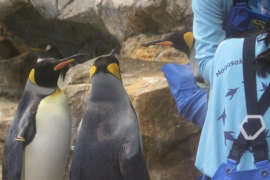 「具合どーや?」 「おーきに」みたいな、長崎ペン水のキングたち。飼育員さんに抱きかかえられて足裏の手...