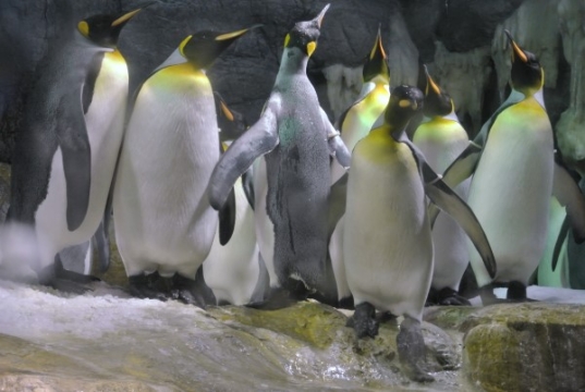 海遊館のキングが2羽でいちゃついていました。一段上からそれを見ているキングがいます。ーーーーーーーーー...