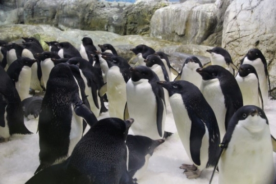 アドベンチャーワールドのアデリーペンギン集団、中には亜成鳥も何羽かいます。目印は、下半分が白い顔。見...