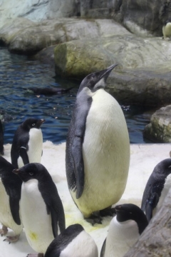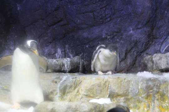 名古屋港水族館のペンギン水槽、右寄りにある大きな岩。一列に並んだアデリーとジェンツーが順番で飛び込ん...
