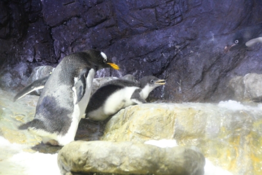 「お家に帰りなさい。」 海遊館のジェンツー父、下のテラスから巣のある段へとヒナを追い上げています。こ...