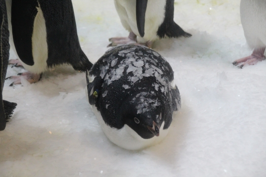 アドベンチャーワールドのアデリー集団、かき氷状の人工雪を浴びています。ずいぶん埋まってきましたが、ー...