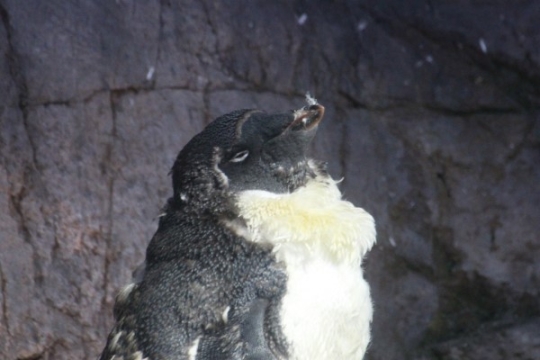 換羽中の海遊館アデリー、頭にご注目を。目の上あたりから向こう側にかけて、白い線が見えます。顔側はすで...