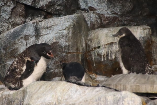 名古屋港水族館のヒゲペン一家。巣には順調に育ったヒナ、そして巣の外では親がお隣のアデリーを威嚇してい...