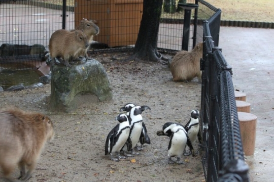 アドベンチャーワールドの夕刻。カピバラがケープペンギンを包囲? 遠巻きにして警戒中? 実は出口に近寄...