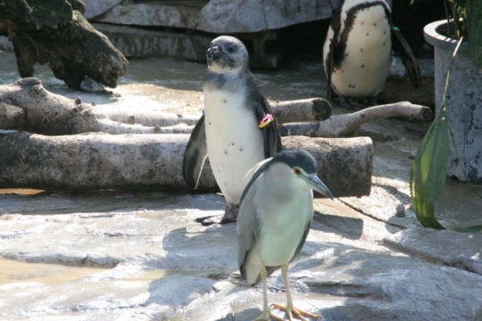 他のペンギンとは違う色合いの個体がいます。ケープの亜成鳥と、手前にいるのはゴイサギ。ブルーグレー、グ...