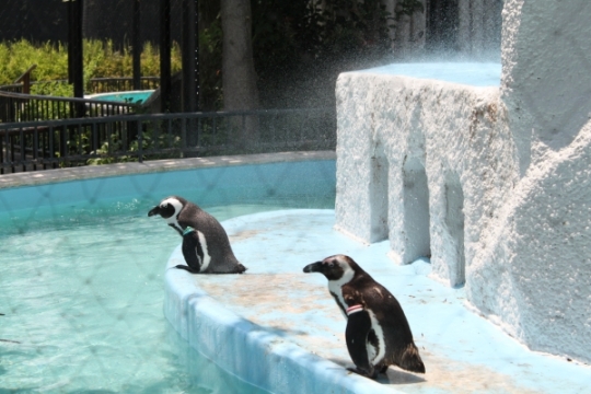 上野動物園のペンギンプール、勢いよく吹き出すシャワーで、水煙があがっています。それを背中に受けて涼む...