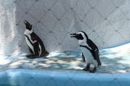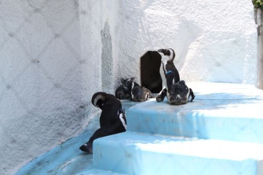 階段で仲良く羽づくろいするケープのペア。この2羽はこの階段がお気に入り場所のようでした。1羽はもうす...