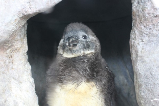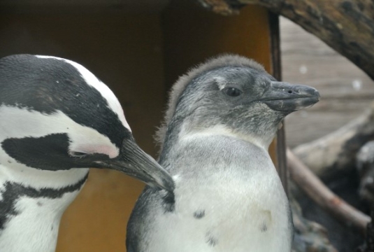 ペンギンの親子、京都水族館のケープです。ヒナは幼綿羽がほとんど抜け落ちて、亜成鳥になってきています。...
