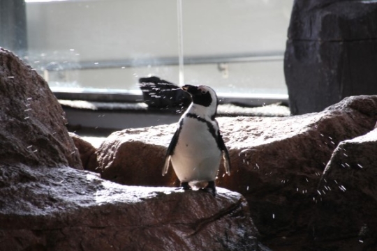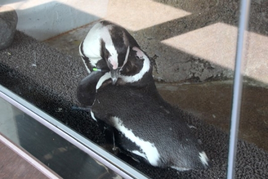 京都水族館、ガラス際の狭い段の上で、ケープのペアがいちゃいちゃ中。立っているケープは、ナナメ後ろを振...
