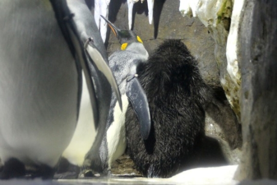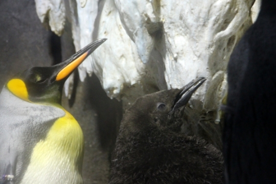 キングのヒナちゃん、お父さんと一緒。お父さんは、ヒナに興味津々な他のキングから我が子を護っています。...