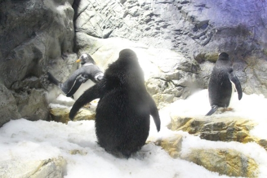 名古屋港水族館のヒゲペンギン、円い巣台にヒナ(中央)と親がいます。お隣はアデリー、奧にもう1羽ヒゲが...