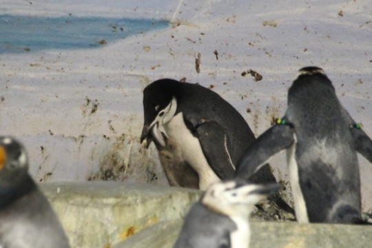さて、ヒゲペンギンのもう一方の親が戻ってきました。さっそく首を伸ばして鳴き交わし挨拶を交わします。ヒ...