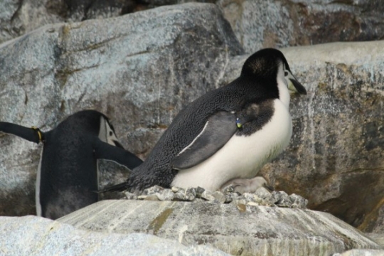名古屋港水族館のヒゲペン一家。巣には順調に育ったヒナ、そして巣の外では親がお隣のアデリーを威嚇してい...