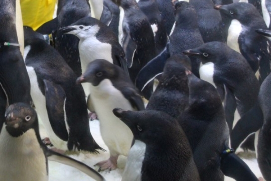 名古屋港水族館では、冬が子育ての季節。照明が南極大陸モードだから、日本の冬がペンギン室では夏になるの...