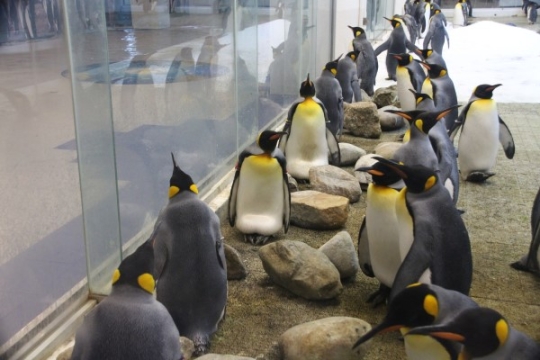 さて、繁殖期を迎えたアドベンチャーワールドのキングたち。よく見ると、アクリルガラス沿いに大きな石を並...