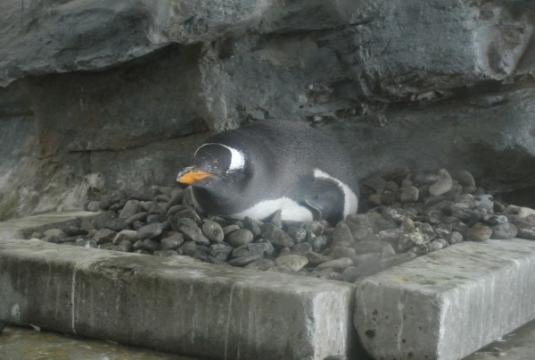 旭山動物園の屋内に巣を構え抱卵中のジェンツー。小石を積み上げるやり方は野生棲息地でのスタイルです。地...