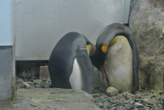 同じく旭山動物園の屋内です。キングの抱卵ペアが、今まさに抱卵交代でタマゴを受け渡しするところです。キン...