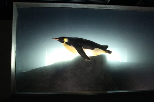 名古屋港水族館のエンペラー、身体を伸ばしてフリッパーをバタバタ動かし始めました。だいぶブレてますが、...