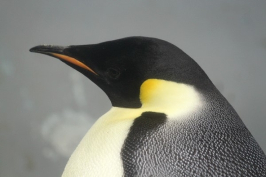 アドベンチャーワールド皇帝の横顔。ソラマメ形のイヤーパッチは閉じておらず、黒い顔と身体側面の黒線との...