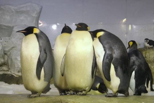 こちらはアドベンチャーワールドの海獣館。エンペラー集団の中に仲良し2羽発見。こちらでも、もたれかかっ...