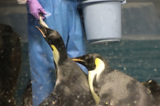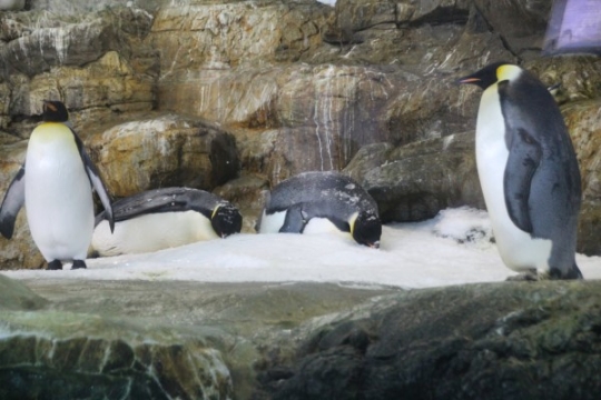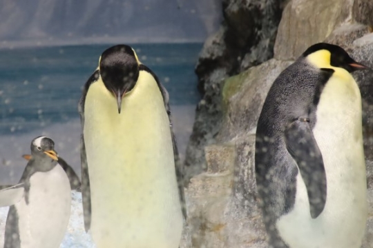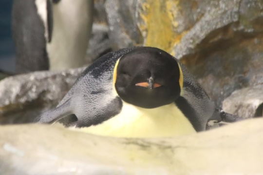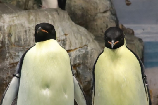 名古屋港水族館のエンペラー2羽、なにやらかしこまっているふう。首を引っ込め、上体を少し前かがみにして...