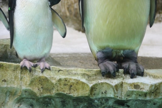 右がエンペラーの足、左がアデリーの足。エンペラーは体重30kg級、アデリーは5kg前後。ボリュームの違いが足...