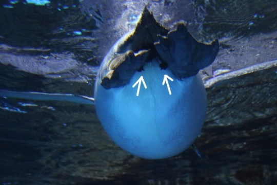 八景島、水に浮かぶキングをおしりの方から見た図です。ハラがまん丸でピカピカ。後方に伸ばした足には大き...