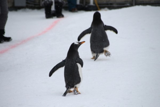 ジェンツーの歩き方、後ろから見るとスキップしているみたい? 旭山動物園でお散歩中のジェンツー。