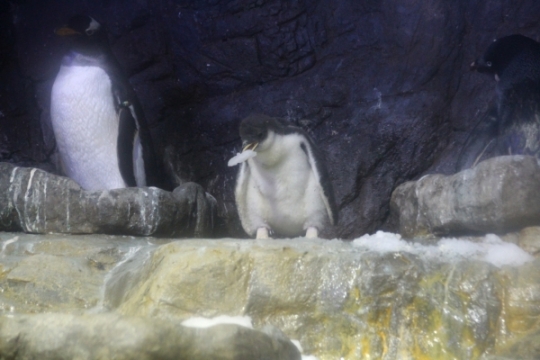海遊館のジェンツーひな、お家の外に出ましたが、お隣のアデリーににらまれています。近づきすぎると危険で...