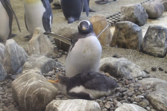 「お家に帰りなさい。」 海遊館のジェンツー父、下のテラスから巣のある段へとヒナを追い上げています。こ...