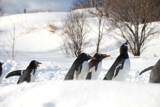 雪の積もった広場を楽しげに歩くジェンツーの群。冬は絶好調です。@おたる水族館