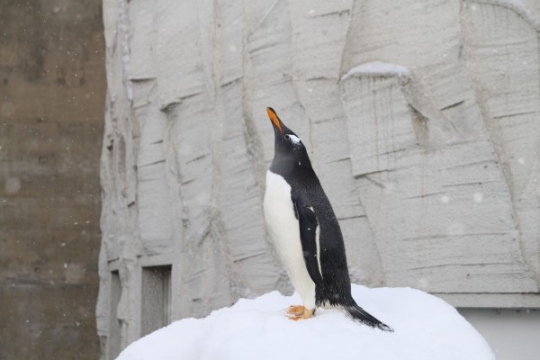 旭山動物園のジェンツー、落ちてくる雪片をじっと見ています。スキがあればつかまえようとします。